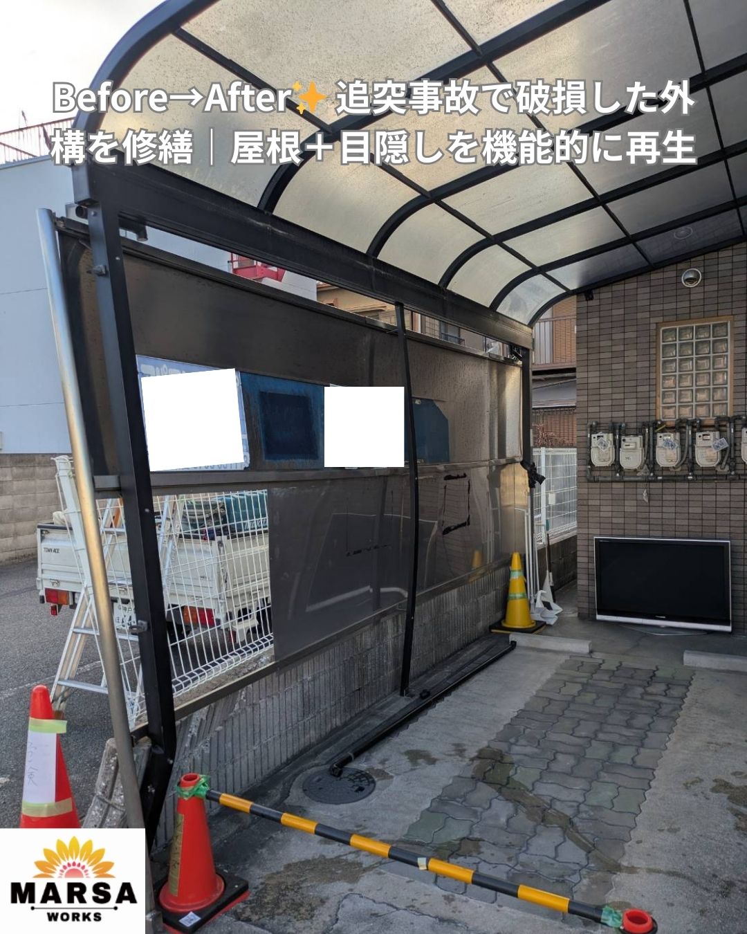 今回は、車の追突事故により破損してしまった外構の修繕工事の施工事例をご紹介します。